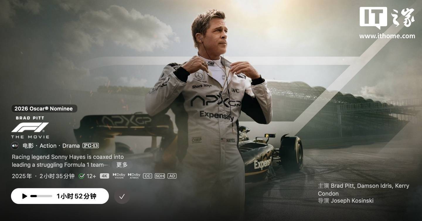 据IT之家了解,《F1:狂飙飞车》现在已在 Apple TV+ 流媒体平台上线。