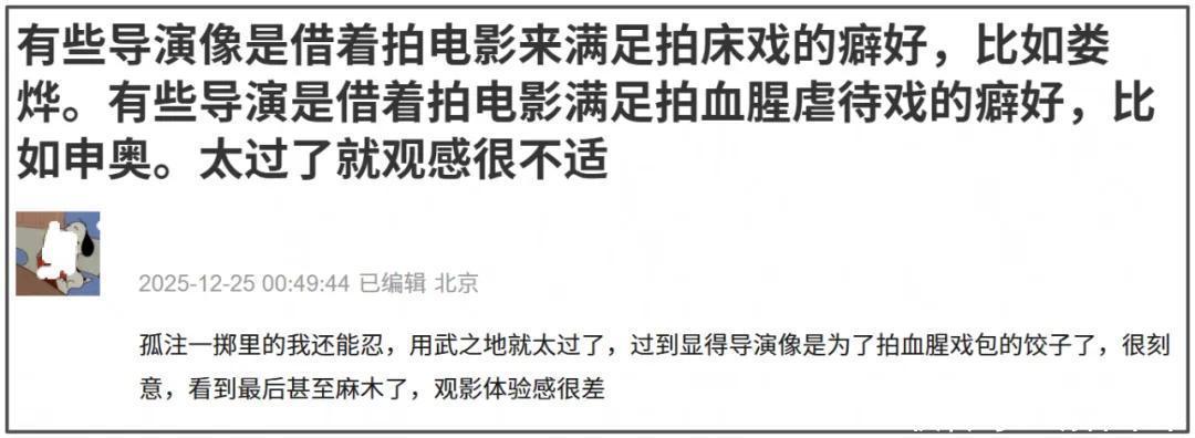 从《作死马医》到《南京影相馆》再到《用武之地》,申奥一次又一次对影片中的血腥暴力镜头进行升级,《用武之地》给东谈主一种有过之而无不足的嗅觉,让东谈主不雅感特等不适。有不雅众以为该片像是导演为了拍血腥戏而包的饺子,太过刻意了,我方看到终末都麻痹了。