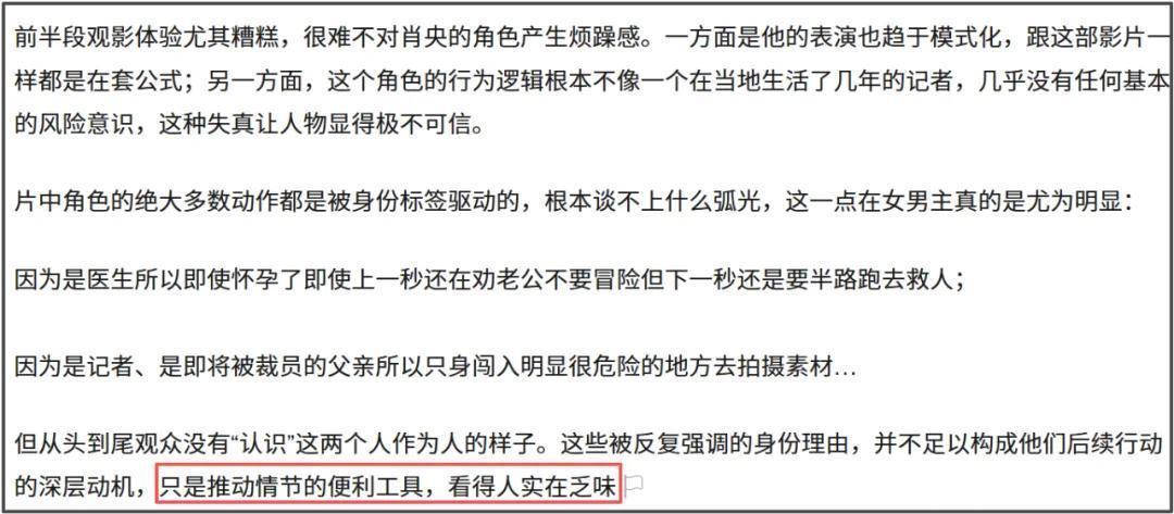 肖央算作影片的男主,功绩是驻外记者,不雅众不错说是奴婢着他的视角去感受故事。因为莫得丰润的东谈主物形象作念撑握,是以肖央就像是个“录像头”男主,为了让剧情奏凯股东,这个“录像头”男主最大的作用等于作念蠢事和纪录其他东谈主的高光,影片中许多异邦东谈主副角都比肖央更有追忆点。