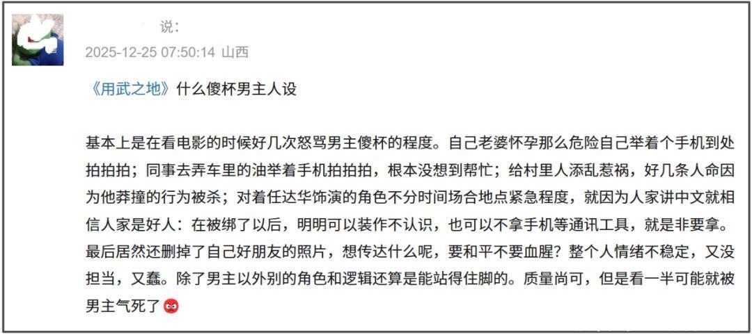 莫得追忆点就放胆,肖央的东谈主设偏巧还有许多槽点。因为东谈主物动机不足、逻辑感不彊,是以不雅众在看到影片中肖央扮演的马笑作念出千般愚蠢行为的期间,最大的不雅感等于不满,直呼男主东谈主设太傻,既莫得担当,又多样犯蠢。当男主成为导演推动故事情节的便利器具,那么奴婢男主视角不雅影的不雅众当然只可感受到厌烦和乏味了。