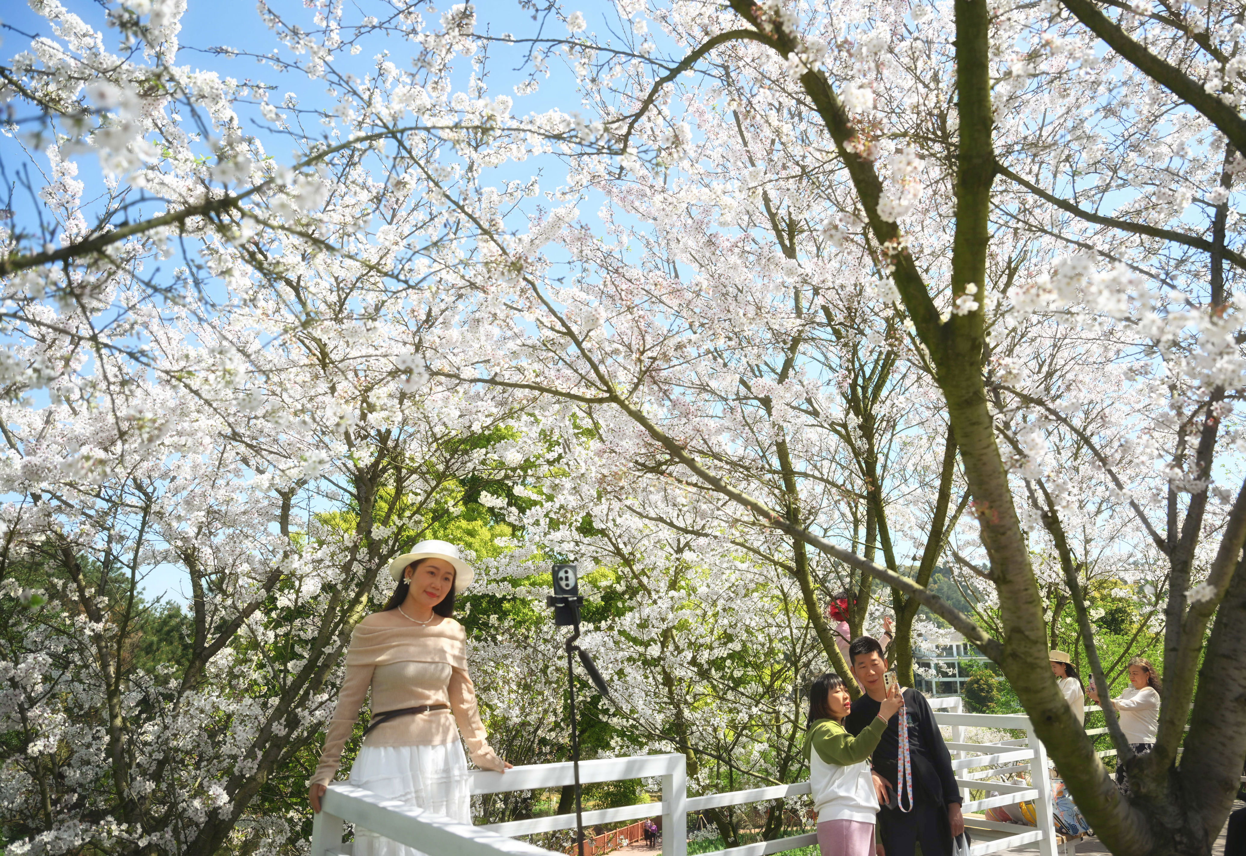 ▲3月10日,巴南区天坪山云林天乡,旅客在樱花树下拍照打卡。记者 刘力 摄