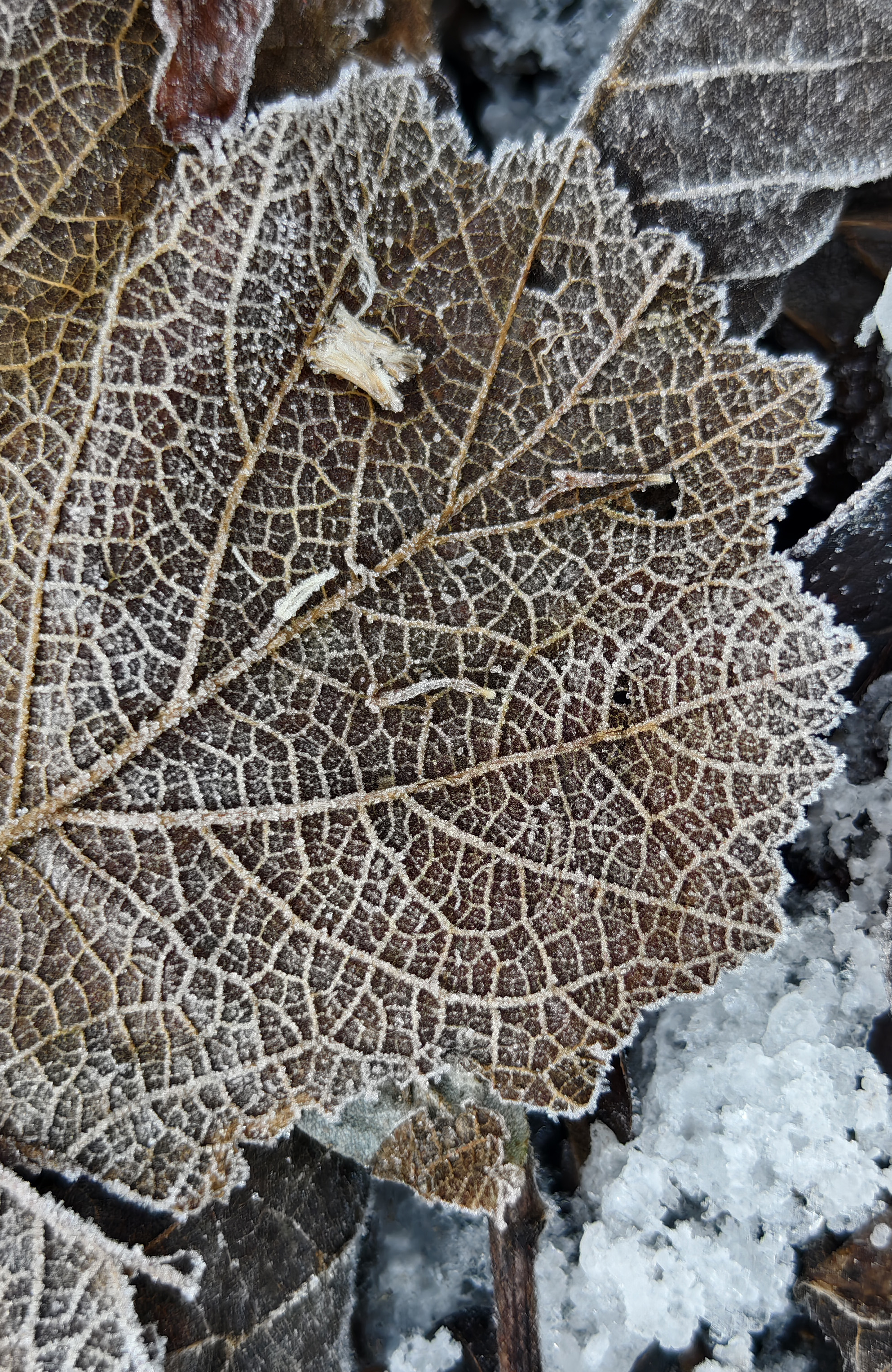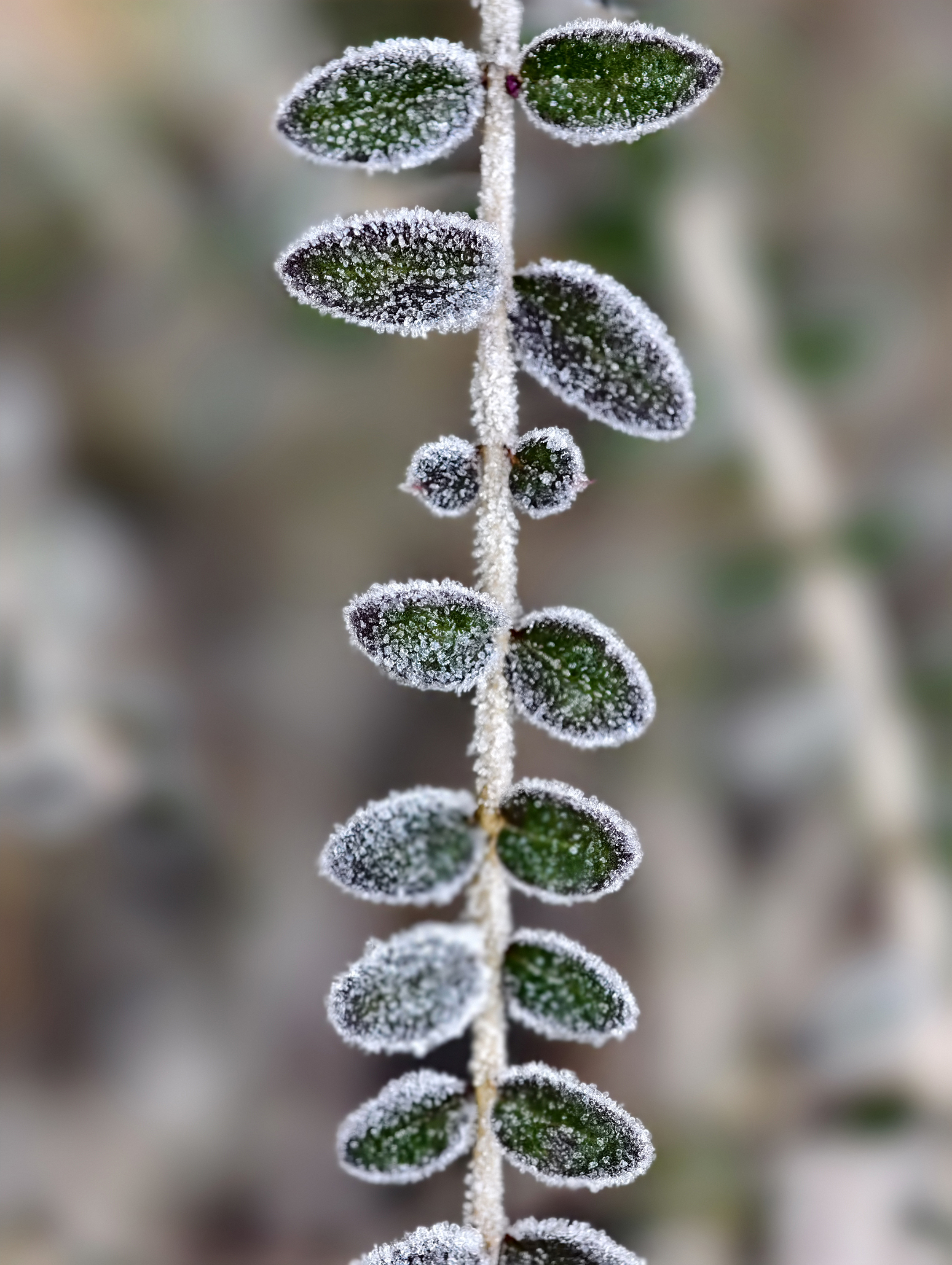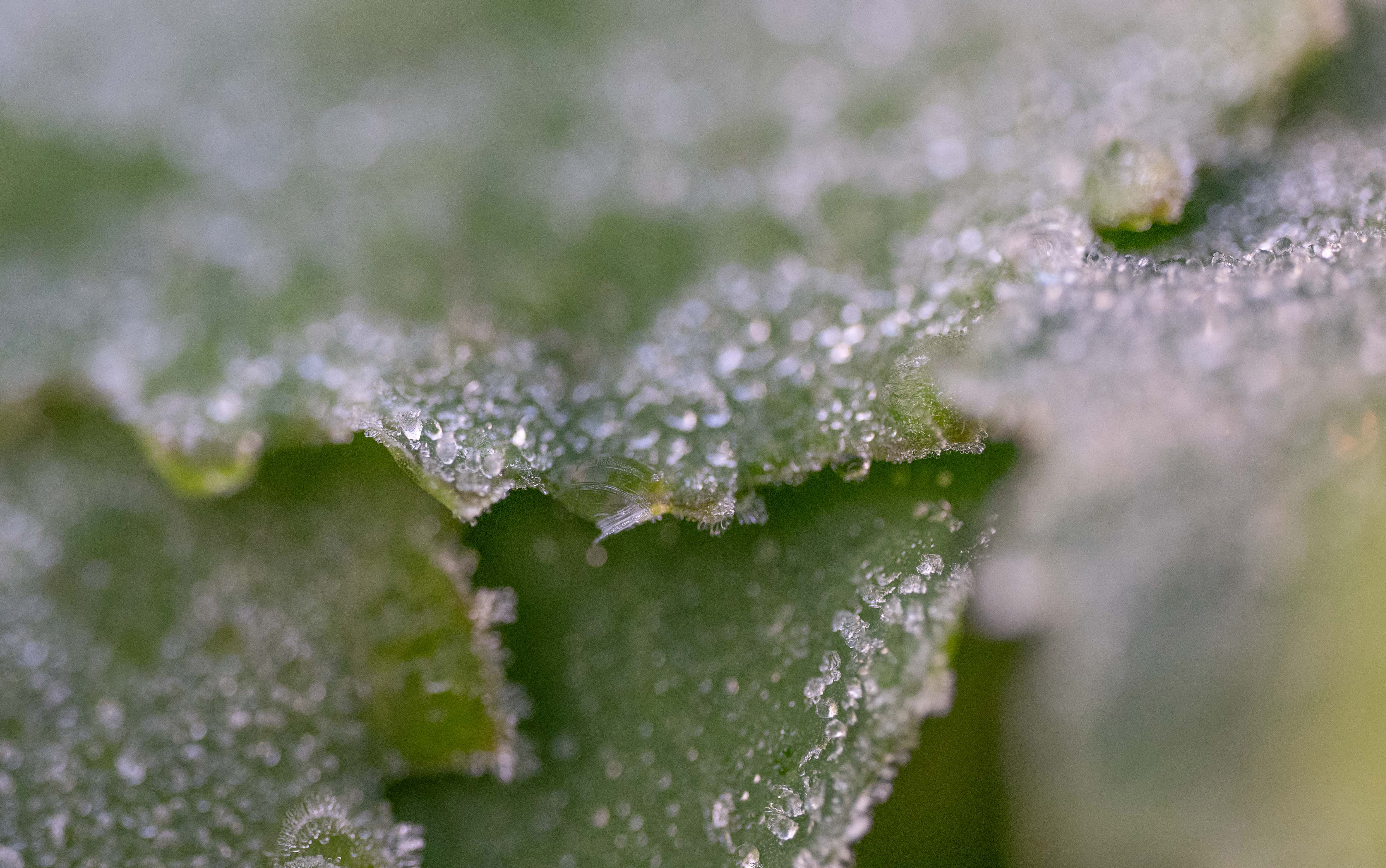 早晨时辰,普遍的温差让植物披上一层白霜。