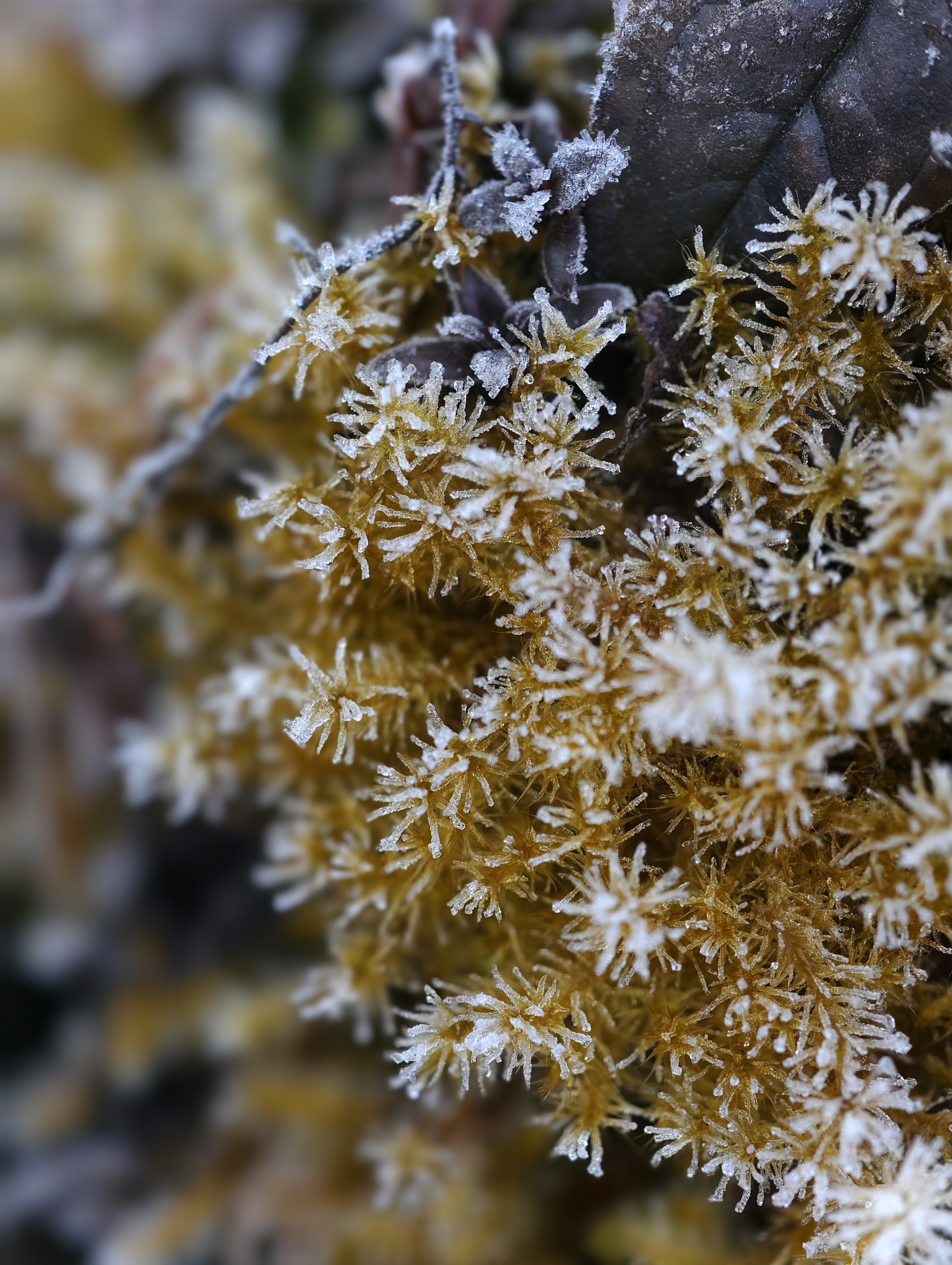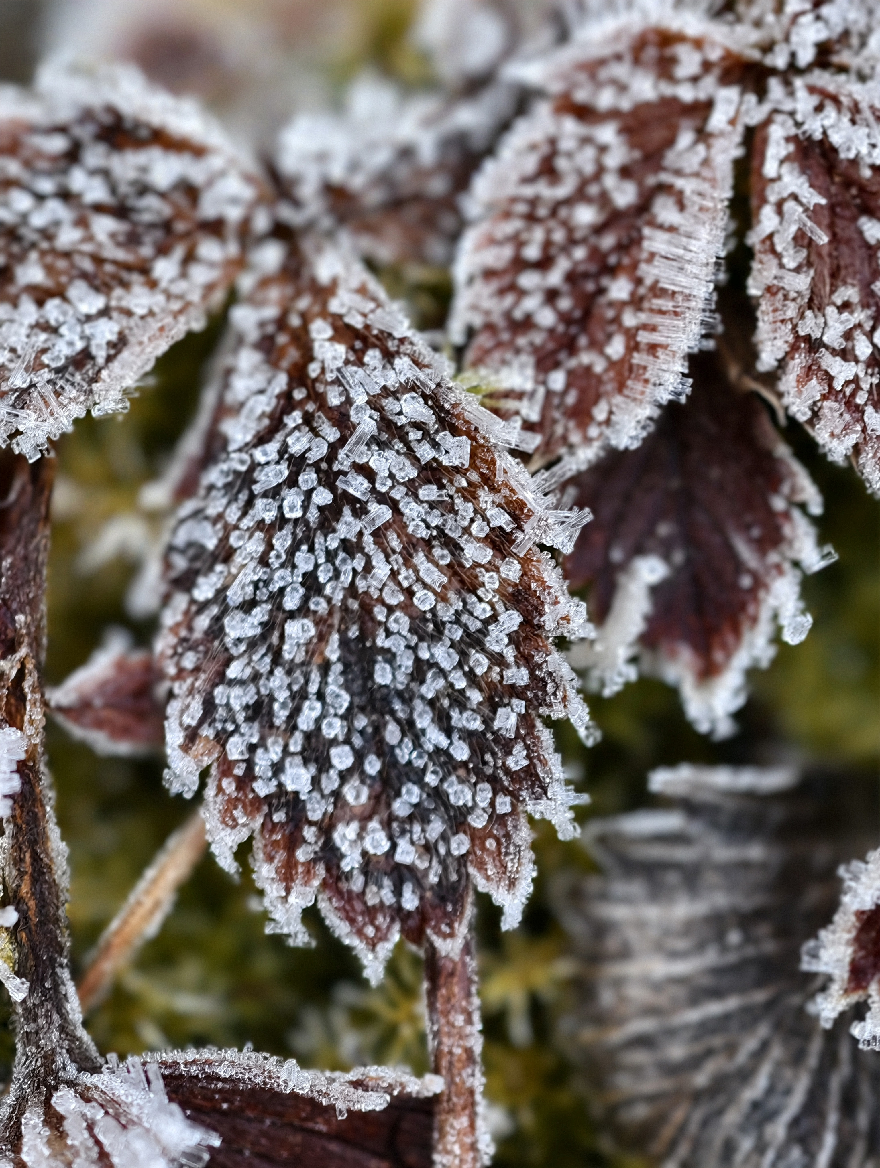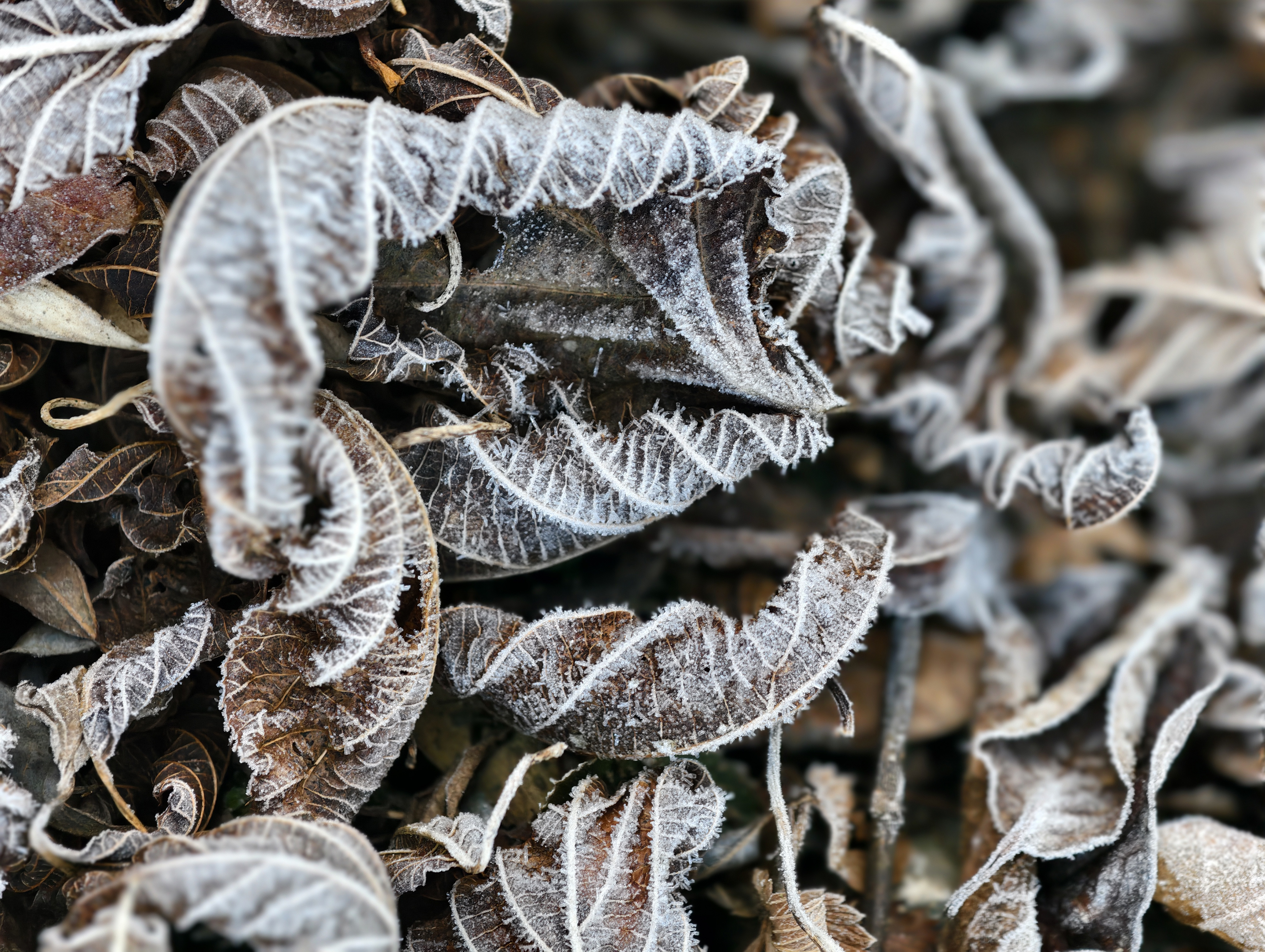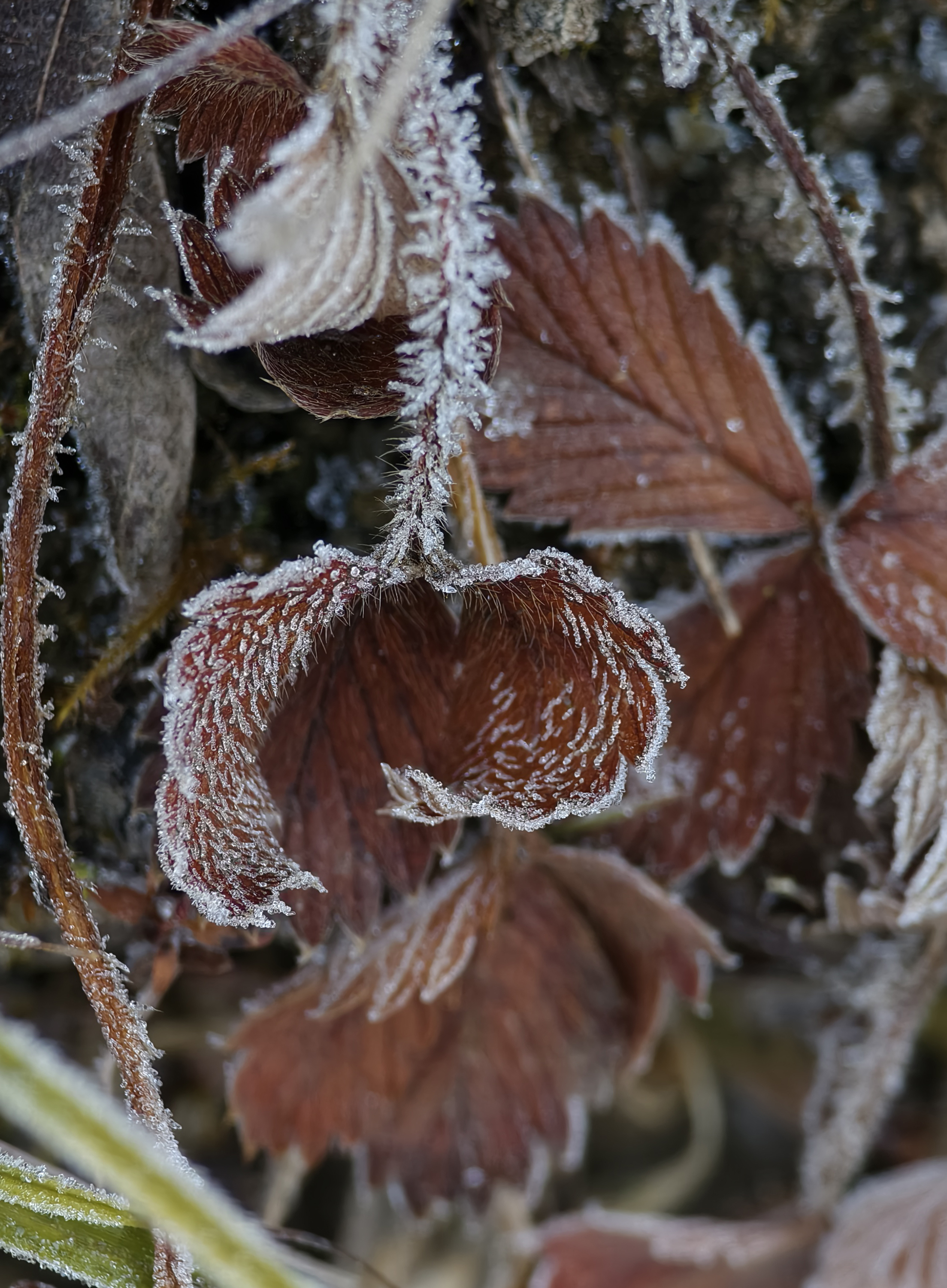 早晨时辰,普遍的温差让植物披上一层白霜。