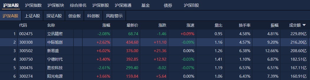沪深两市成交额2.37万亿,较上一个往返日放量443亿。个股上,立讯精密全天成交额近230亿元居首,中际旭创、新易盛、宁德时期等成交额居前。