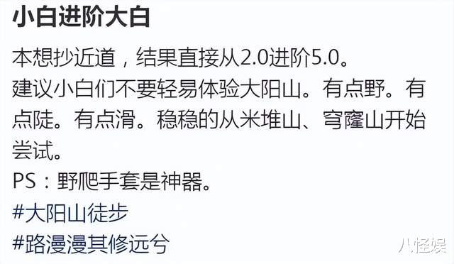 自认是爬山小白的沈佳妮,此次野爬大阳山,她夸耀称原来仅仅思抄近谈,没思到从2.0进阶成5.0,积聚了不少爬山教育的沈佳妮还大方共享了出来,她冷漠小白们不要毛糙体验大阳山,有点野,有点陡,有点滑。