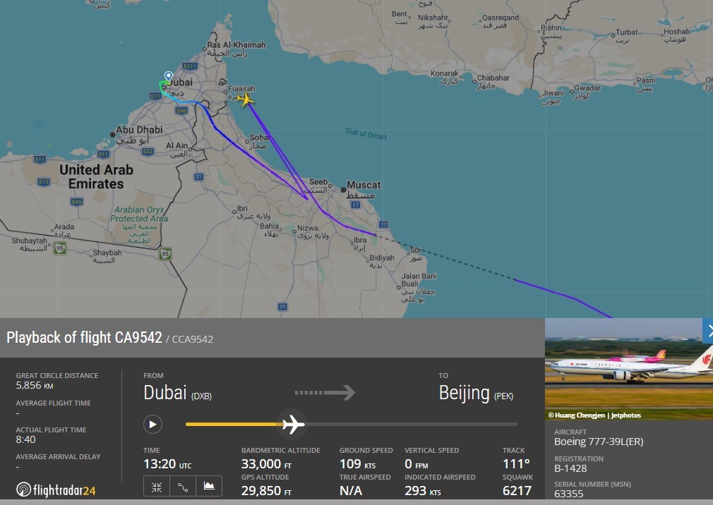 诚然迪拜机场不错起降,然而起降自己就有着极大的不笃定性。哪怕飞机得手降落在迪拜机场了,能不可准时走,致使能不可走王人是问题。3月7日,国航CA9542航班从迪拜腾飞准备飞归国内时,本色腾飞时候就比贪图腾飞时候延误了四个半小时。况兼从FR24上的ADS-B定位轨迹中不错看出,在飞到阿曼上空时CA9542飞机还碰到了GPS滋扰,使得飞机的定位坐标短时候内发生偏移。