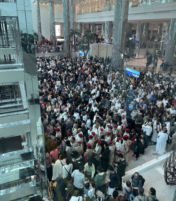 无数淹留在迪拜机场里的搭客,其中还能看到有阿联酋航空的机组
