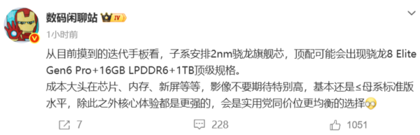【CNMO科技音尘】3月20日,数码博主“数码闲说念站”发文称,子系机型将搭载2nm骁龙旗舰芯,顶配版块可能会接纳骁龙8 Elite Gen 6 Pro+16GB LPDDR6+1TB的顶级规格。新机的老本主要蚁合在芯片、内存、新一代屏幕等方面。此外,子系新机的影像智商不会有大幅普及,大约率是不高于母系时势版的水平。